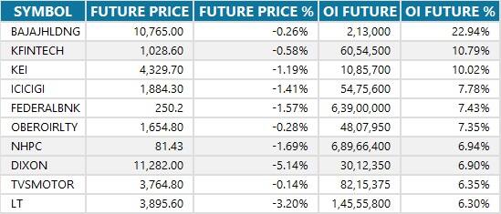 A long build-up was seen in 32 stocks. An increase in open interest (OI) and price indicates a build-up of long positions.