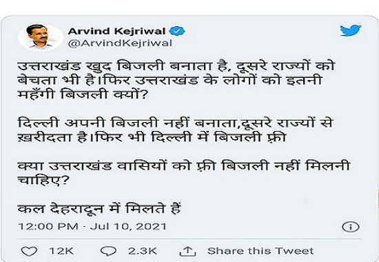 “Uttarakhand generates electricity and also sells it to other states. Then, why is electricity so expensive for the people of Uttarakhand? Delhi does not generate its own electricity and buys it from other states and yet, electricity in Delhi is free. Shouldn't the people of Uttarakhand get free electricity? See you tomorrow in Dehradun," Kejriwal said in a tweet in Hindi.